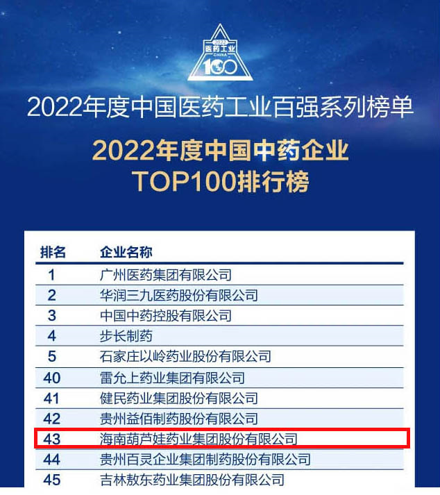 会议期间,一年一度的中国医药工业百强系列榜单隆重揭晓,东升国际药业集团凭借领先的研发优势和扎实的生产实力以及稳健的市场推广能力,连续第四年成功入选“2022年度中国中药企业TOP100排行榜” ,排名稳步上升至第43位。